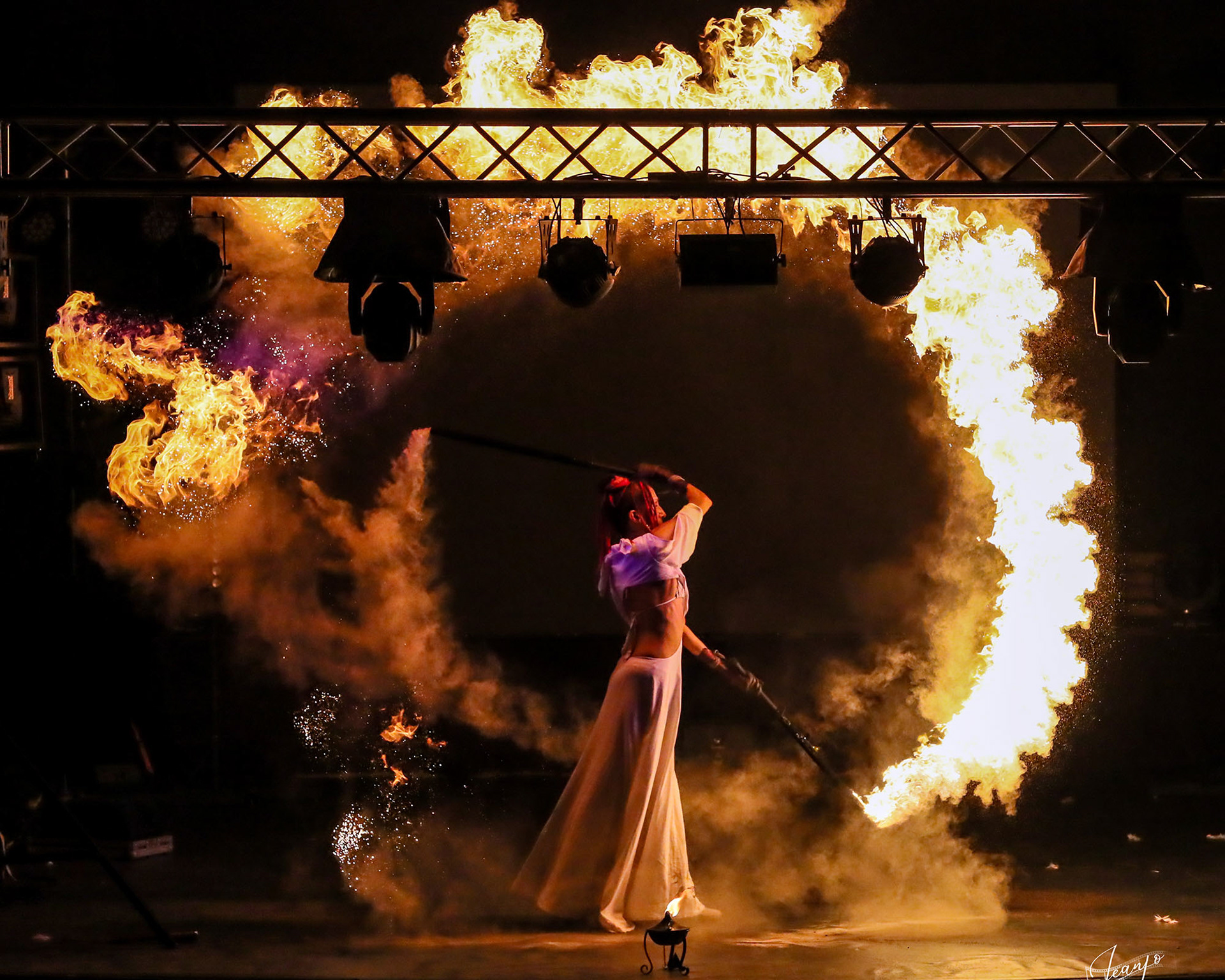 Au gré des rythmes tribaux, les flammes ondoient, volent, dessinent des spirales à l’infini et jaillissent à travers des pluies de paillettes de feu...