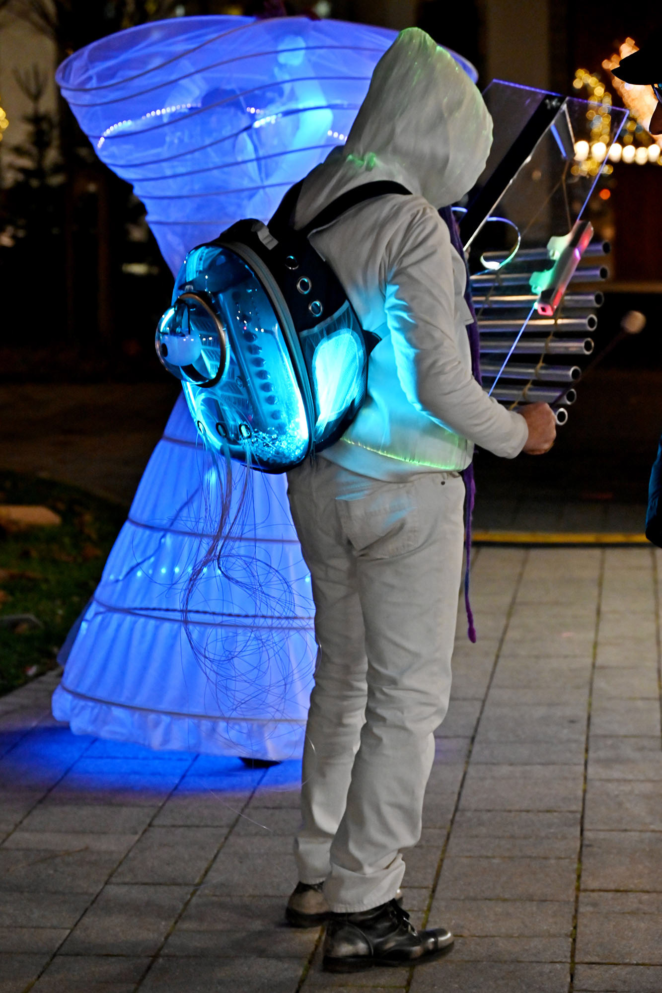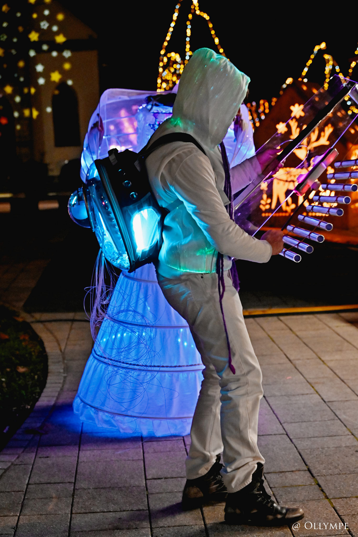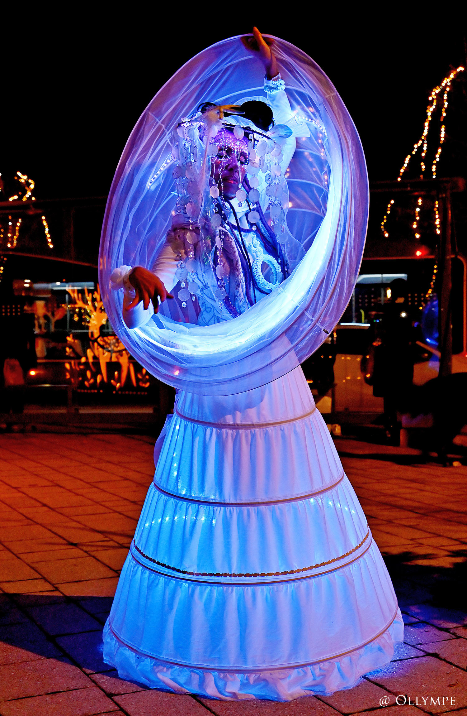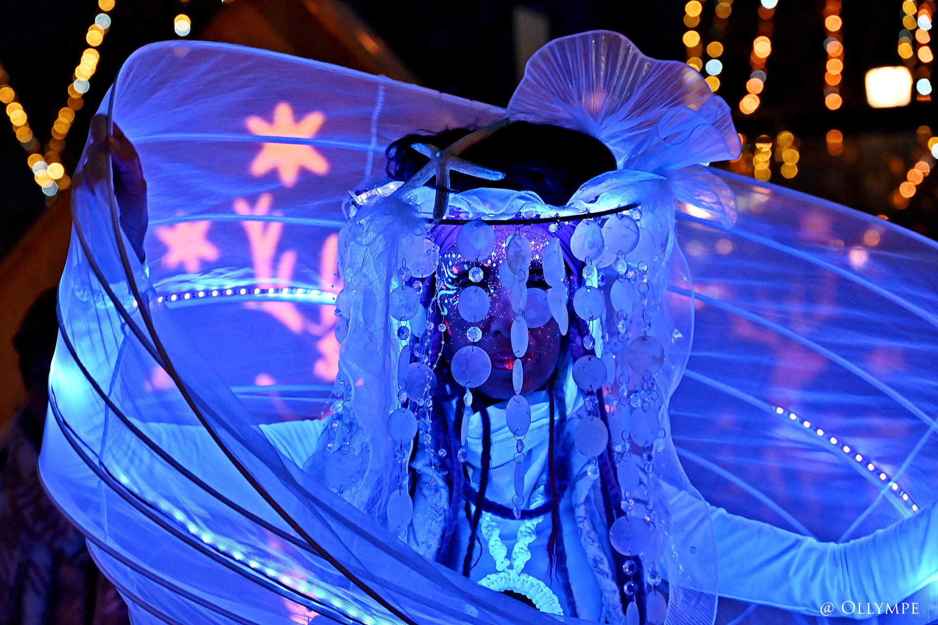 Baignées dans la magie des sons cristallins, ces créatures luminescentes, venues des royaumes abyssaux, évoluent, flottantes dans un théâtre de danse, dans une grâce infinie, évoquant la beauté délicate de la vie des profondeurs marines. Leurs peaux ornés de maquillages phosphorescents qui se révèlent à la lumière noire, captent le regard et inspirent la contemplation.